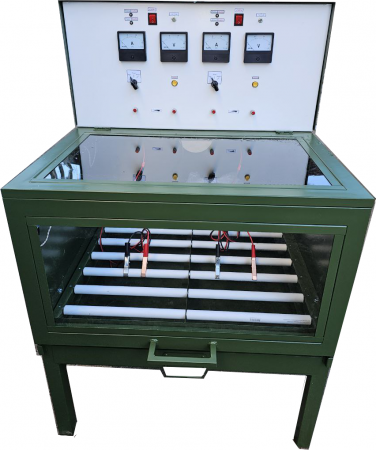 Устройство оборудовано: системой защиты от включения при открытой крышке аккумуляторного отсека, рольгангами для удобства установки аккумуляторов, лотком для сбора электролита.